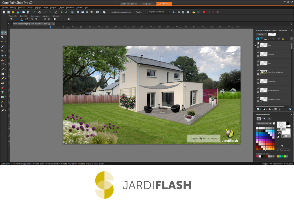 Logiciel architecture professionnel de photomontage dédié aux métiers du paysage, le Jardiflash fournit des visuels réalistes pour des projets de paysage et de piscines. La bibliothèque, d’une qualité exceptionnelle, est riche de 12000 images de synthèse tels que végétaux, textures, mobiliers ou encore minéraux.